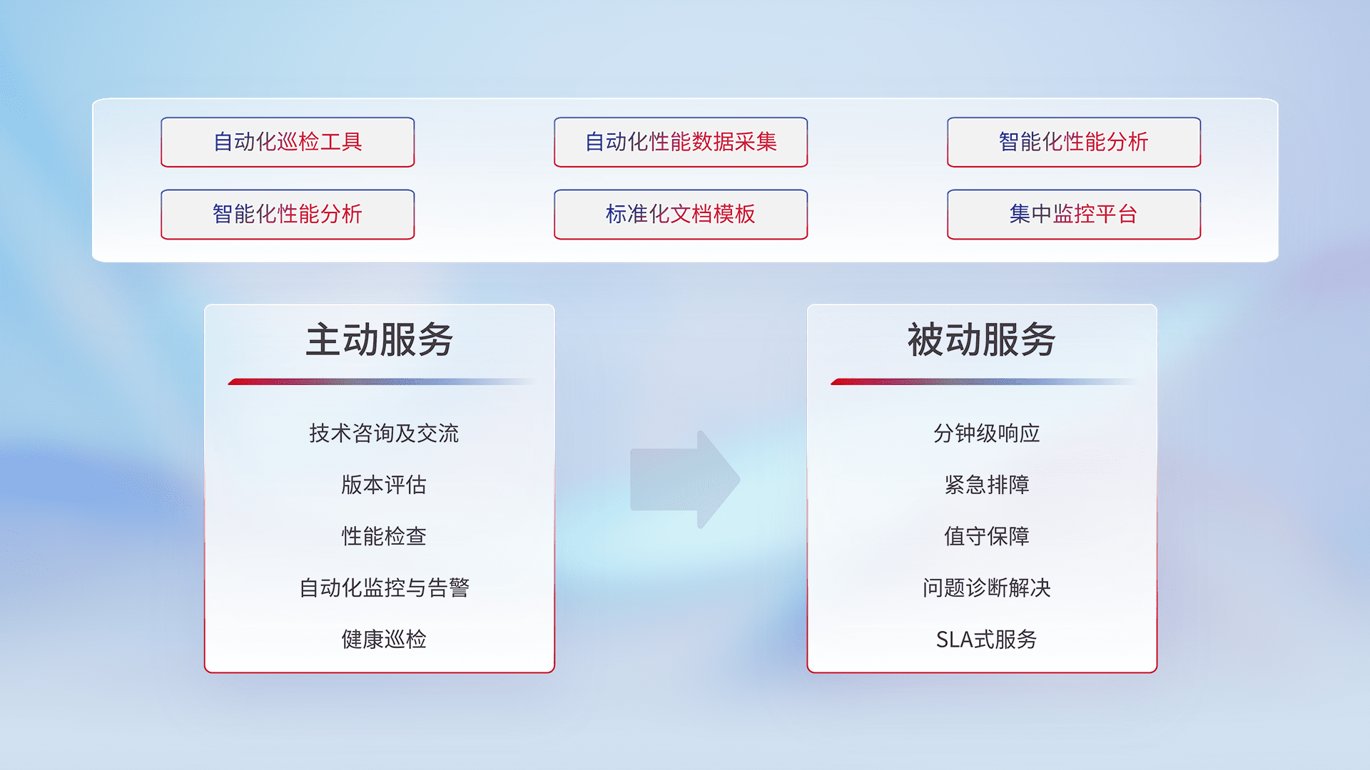 智能化工具和标准化文档,,保障服务质量,,,提供主动服务(包含技术咨询、、、、版本评估、、性能检查、、自动化监控与告警、、、健康巡检)和被动服务包含(分钟级响应、、、、紧急排障、、、值守保障、、问题诊断解决、、SLA服务)。。